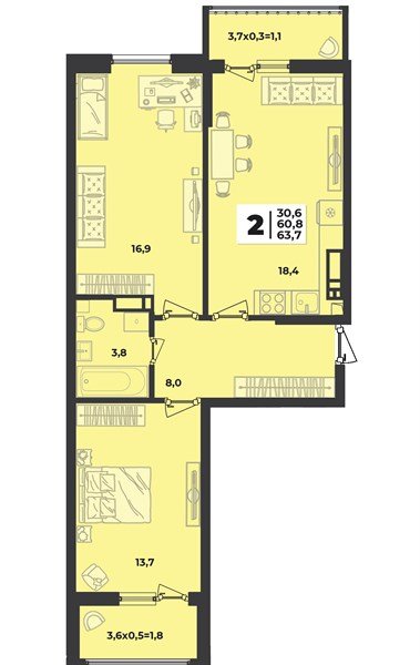2-комнатная квартира 63 м²
