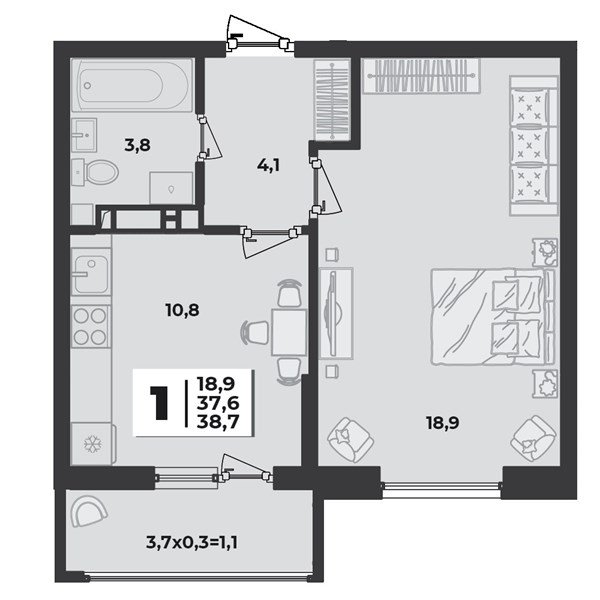 1-комнатная квартира 38 м²